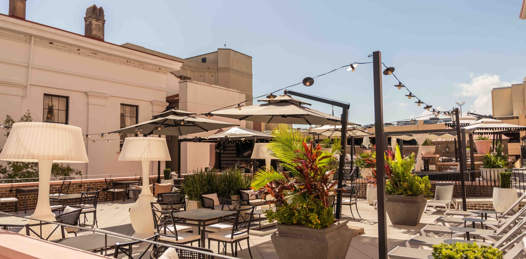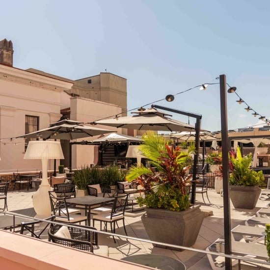 Located poolside, our rooftop bar and lounge area is open to locals to stop in for a drink and will serve up delicious cocktails and elevated bites. Please note our pool is reserved for hotel guests only, but you’re welcome to enjoy the bar area or rent a cabana to take a dip!