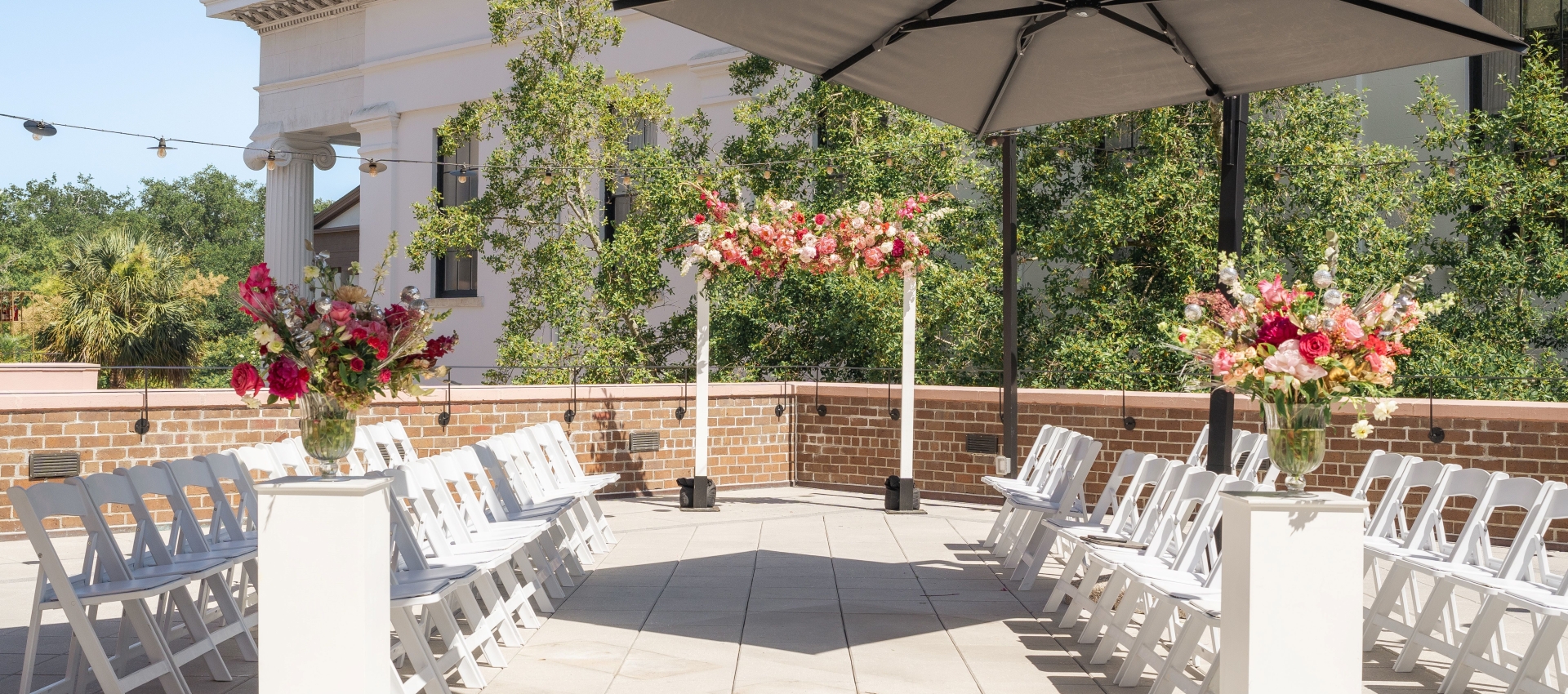 A stunning place to gather, where our pretty pink building with its iron archways contrasts with the cool blues of the pool. It’s where bright flowers bring a pop of color next to the brownstone brick pool deck. Let the soothing soft color palette of this outdoor venue bring Southern charm to your wedding day. Experience a Virtual Tour of this space.